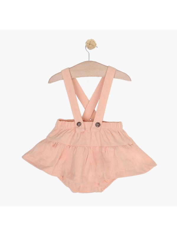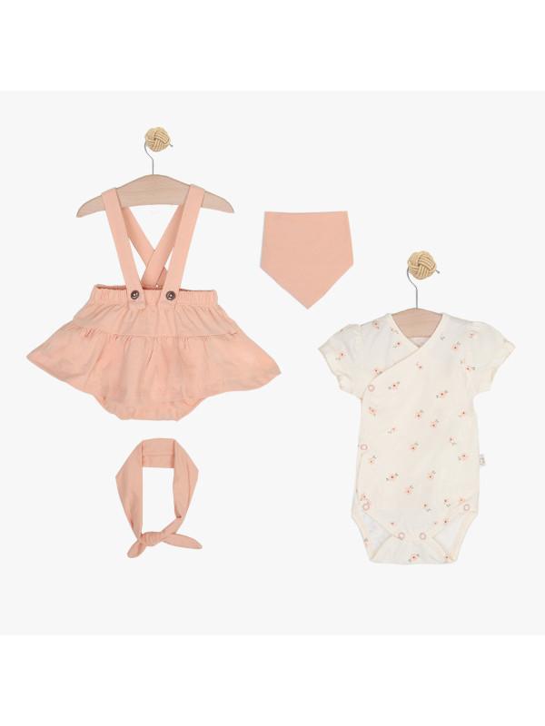 Letnji set za iznošenje beba devojčica. Sastoji se od bodija, suknje sa tregerima koje se kopča u pelenskom predelu, portikle i trake za kosu.Može se nositi i kao svakodnevni komplet za novorođene bebe.